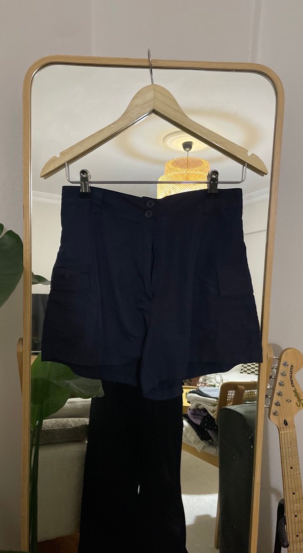 Lacivert keten kumaştan, rahat kesimli midi hamile şortu, minimalist ve şık sokak tarzı sunar. Fermuarı bozuk