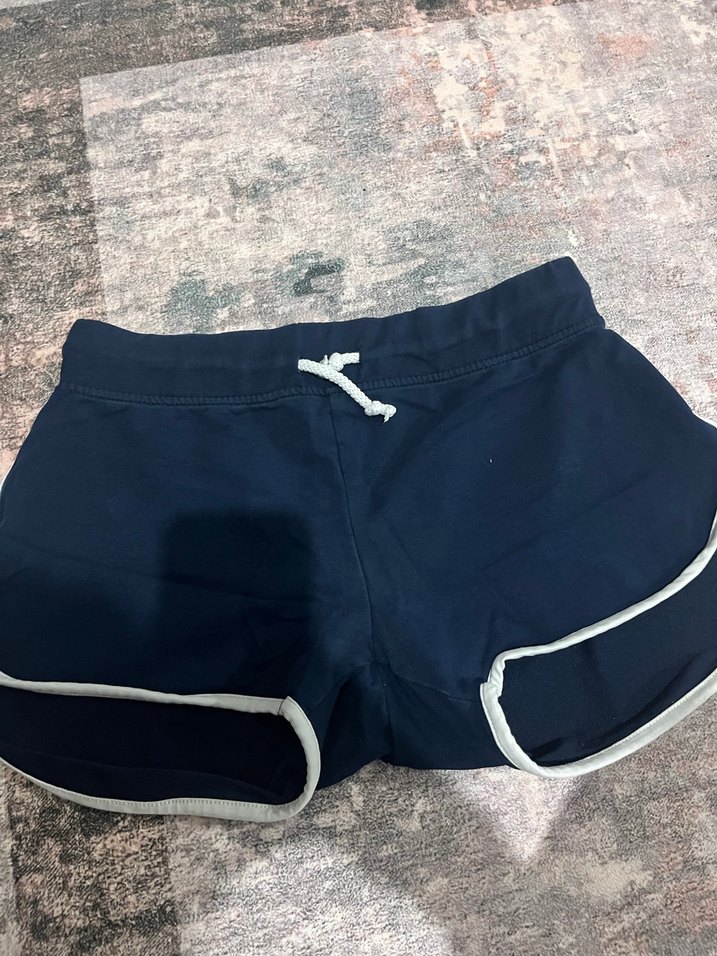 Lacivert mini spor şortlar, elastik bel bandı ve yumuşak kumaş ile dış mekan sokak giyimi için uygundur. Beyaz kenar detayları bulunur.