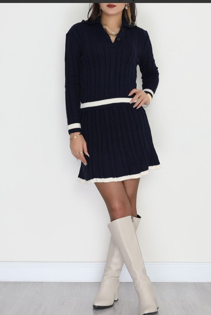 Lacivert mini triko elbise, uzun kollu ve yüksek yakalıdır. İnce kesimi ve beyaz detaylarıyla ofis için uygundur. Örgü kumaştan yapılmıştır. standart bedendir s m ve l uygundur