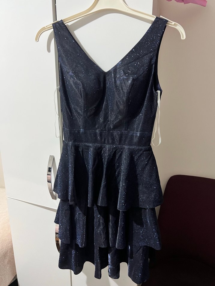 Lacivert Mini V Yaka Fırfırlı Abiye Elbise simli