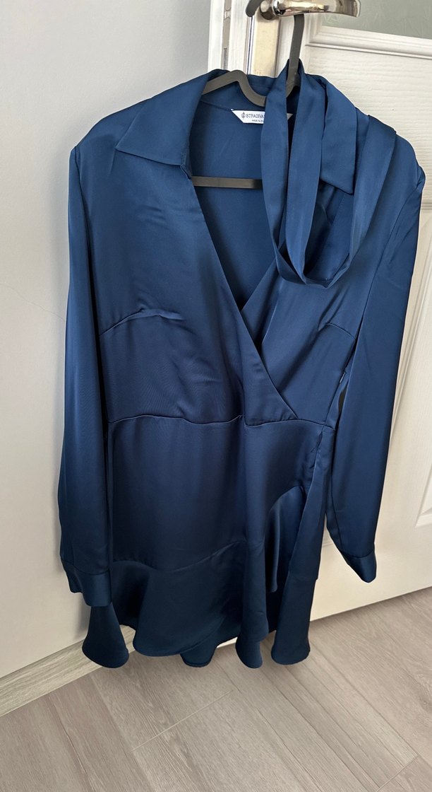 Lacivert mini saten gömlek elbise, uzun kollu ve V yakalı, vücuda oturan kesime sahiptir. şık ve ofis ve gece için uygundur. Yandan fermuarı mevcuttur. Aynı zamanda aynı kumaştan, kumaş kemeri vardır. Ürün hiç giyilmedi. Hamile olmadan önce almıstım hamilelikle birlikte hızlı kilo aldığımdan elbiseleri hiç giyemedim şuanda da doğum kilolarımdan dolayı elbiselerin bedeni olmuyor.