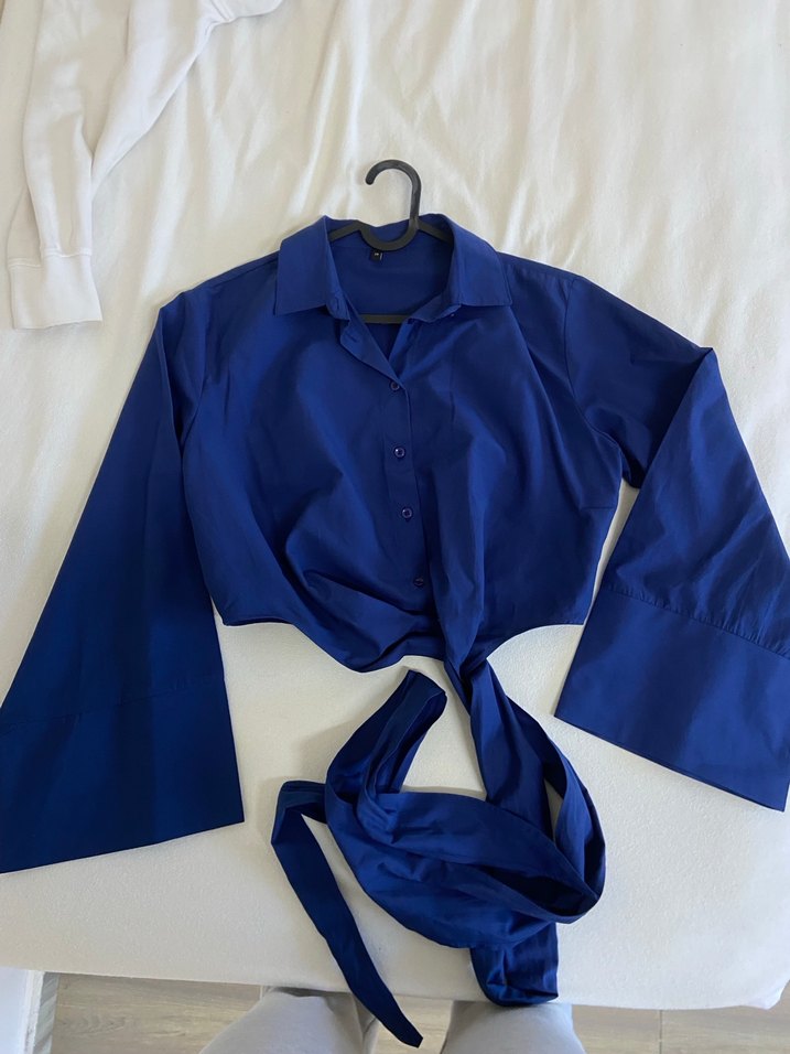 Lacivert kadın gömlek, uzun kollu, yakalı, düğmeli ve kısa kesimdir. Rahat kesimi ve bağlamalı detaylarıyla günlük kullanıma uygundur.