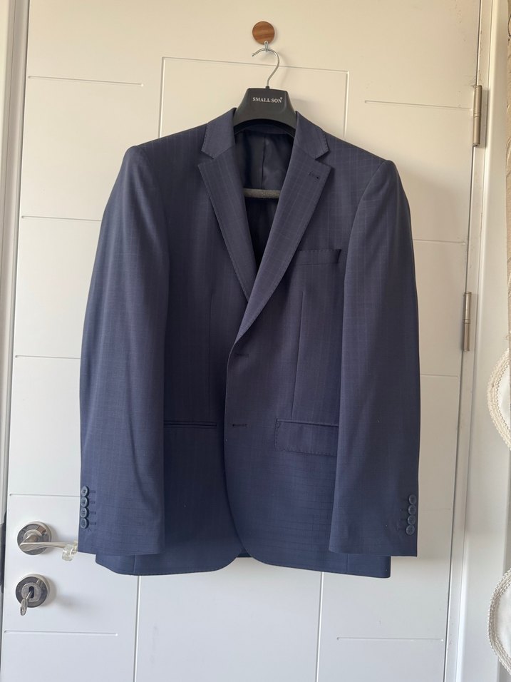 Lacivert renkli, düğmeli ve klasik yaka detaylı erkek takımı. Normal kesim, uzun kollu ve modern klasik tarzda, ofis kullanımı için uygundur. İki kol arası 49 cm