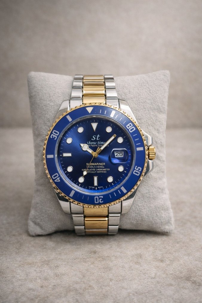 Parlak lacivert kadranlı, tarih göstergeli Gümüş-altın renkli metal bilezikli Modern klasik erkek saati. ⌚