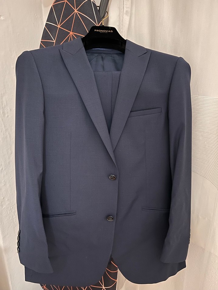 Lacivert renkte, düğmeli, modern klasik tarzda erkek takım elbisesi. Normal midi boyda, uzun kollu ve klasik kesimdir