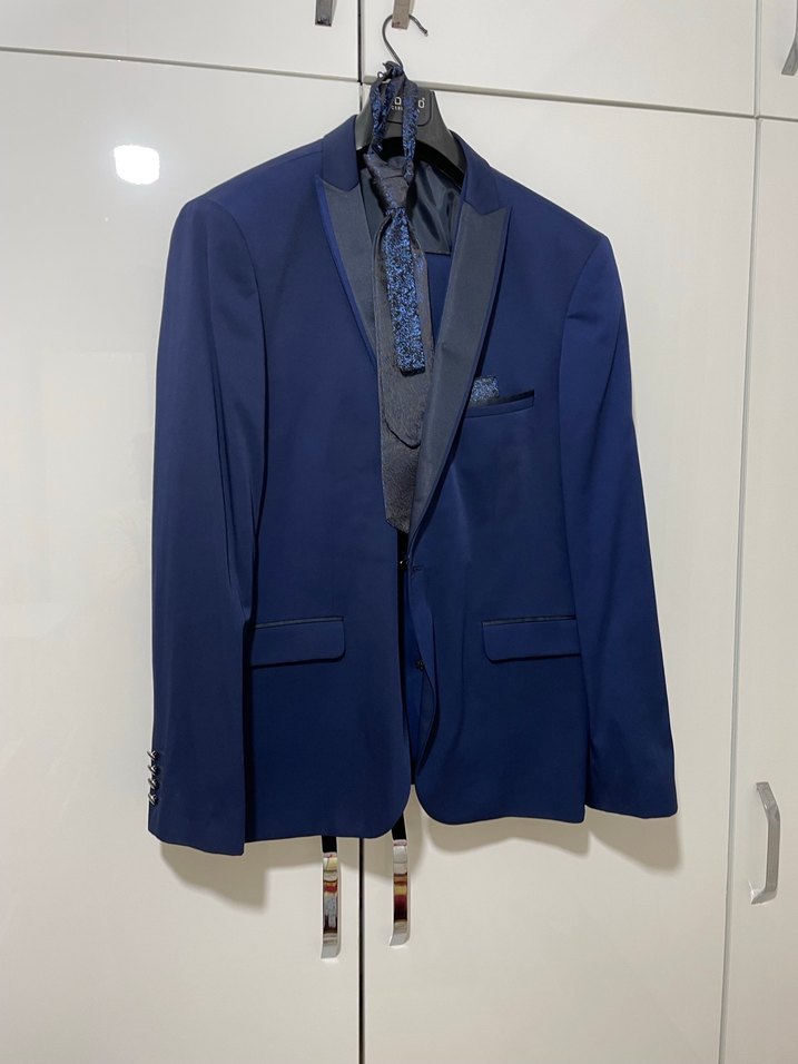 Lacivert renkli, düğmeli ve klasik yakalı erkek takım elbisesi. Modern klasik tarzda, ofis için uygun, normal boy ve desen içermeyen tasarım.