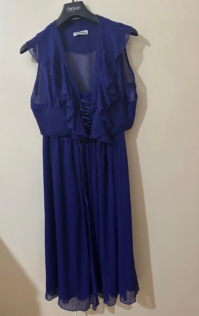 Mor- lacivert arası, Şeffaf kumaş Uzun astarlı, beli lastikli etek ve astarsız yelek. Takım olarak satılmaktadır..