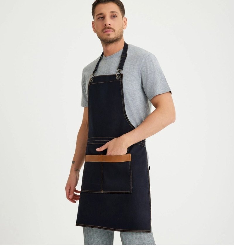 Lacivert renkli işçi önlüğü, ayarlanabilir boyun askısı ve kahverengi detaylı iki ön cep içerir, dayanıklı kumaştan üretilmiştir. kot onluk sifir urun