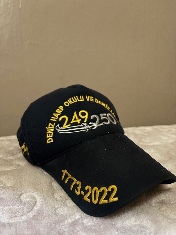 Lacivert renkli, sarı nakışlı yazılar ve sayılarla süslenmiş erkek spor şapkası. Kavisli siperlikli ve ayarlanabilir arka kısmı vardır. Deniz Harp Okulu 249.yıl (2022) özel üretim anı şapkası. koleksiyonerlere