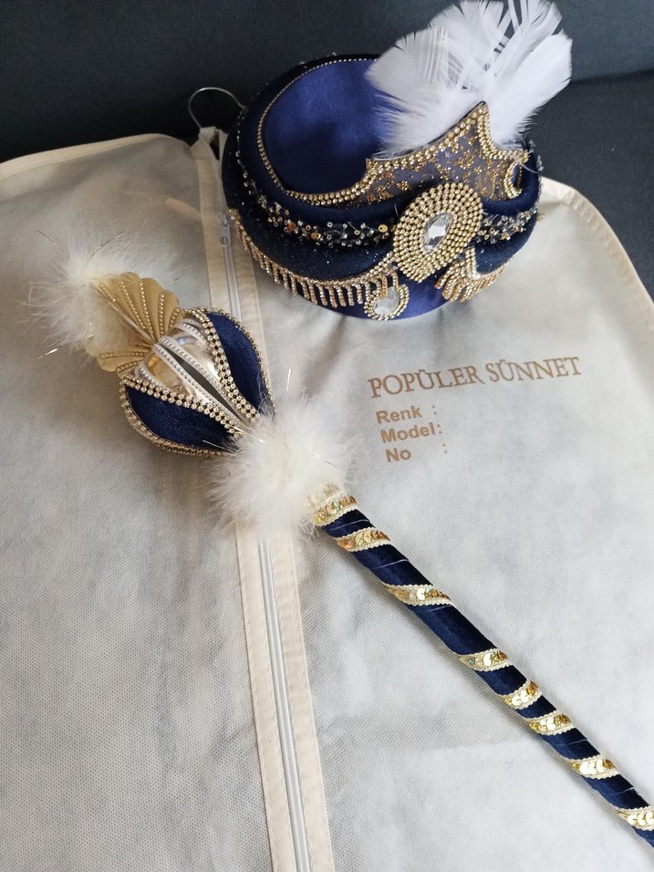 Lacivert renkte, nakışlı ve püsküllü çocuk sünnet kıyafeti. Düzenli kesim, askılı kol ve çentikli yaka detaylarıyla bohem, retro tarzını yansıtır. Tüy ve boncuk süslemeli aksesuarlar dahildir.