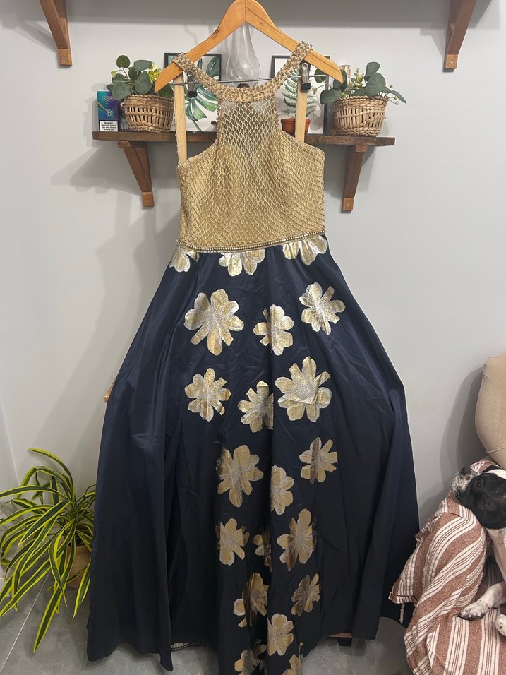 38bed uygun Lacivert renkli, nakışlı, askısız ve kolsuz uzun bohem elbise. Drapeli ve klasik şıklıkta, düğünler için uygun, rahat kesim.