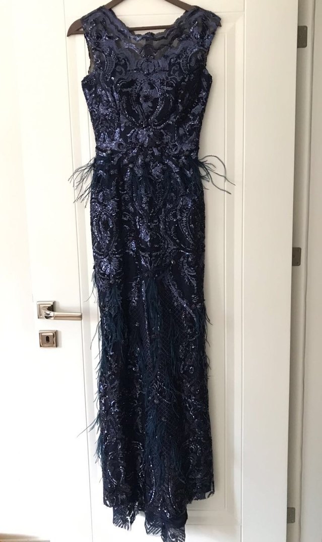 Lacivert Nakışlı Uzun Kadın Abiye Elbise