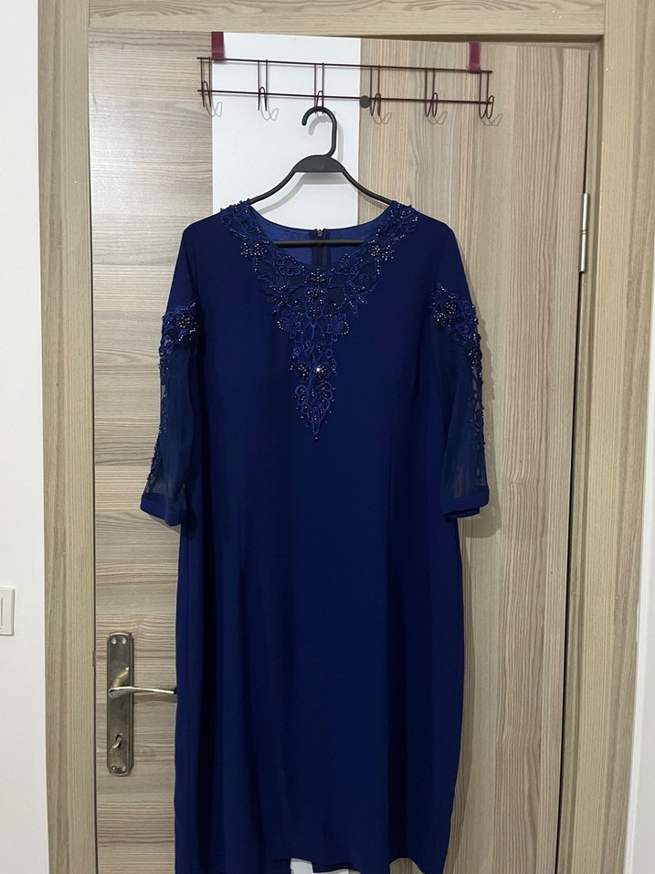 Lacivert uzun, bol kesim kadın abiye elbise. Kısa kollu, V yakalı ve nakış detaylıdır. Düğünler için uygun, sade ve bohem tarzda klasik şıklık sunar.
