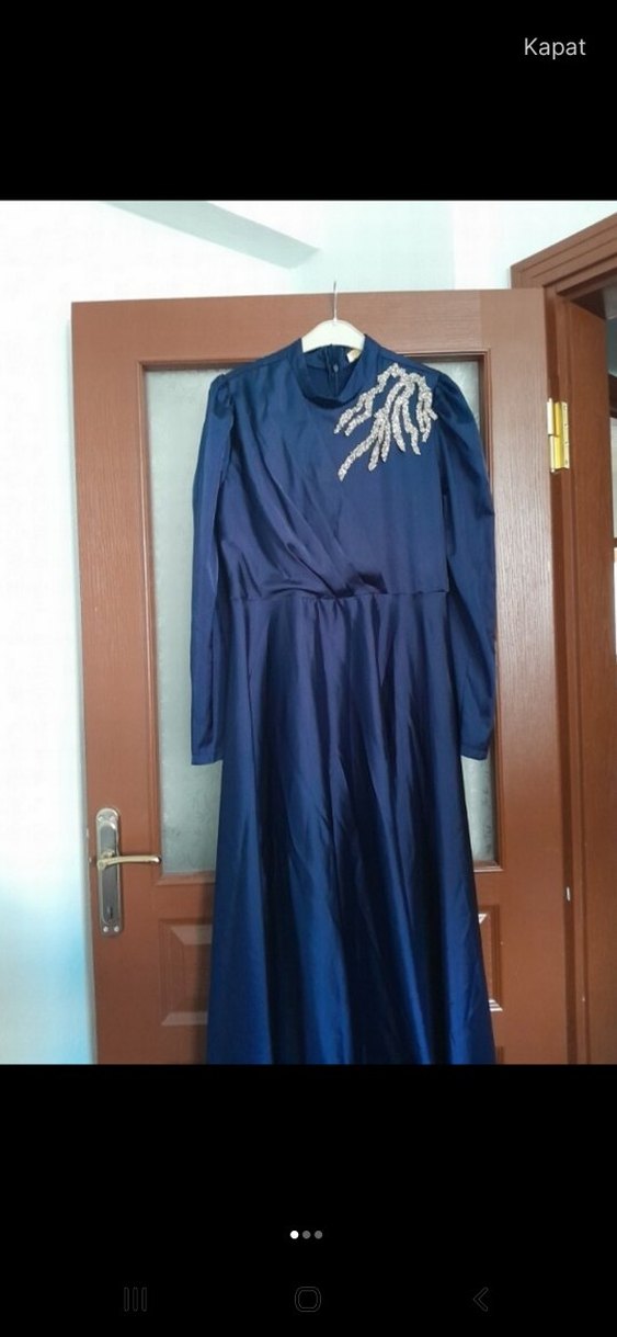 Lacivert, uzun kollu, yüksek yakalı, drapeli ve omuzda nakış detaylı abiye elbisedir. Düğün için uygun, düzenli kesim ve modern bir tasarıma sahiptir.