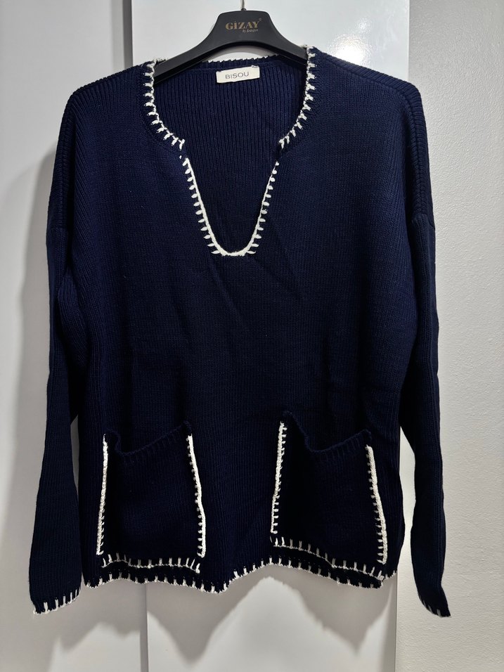 Lacivert renkli, beyaz nakışlı kenar detaylarına sahip, uzun kollu ve bol kesim örme kazak. Önünde cepler bulunur, bohem tarzda rahat bir modeldir.