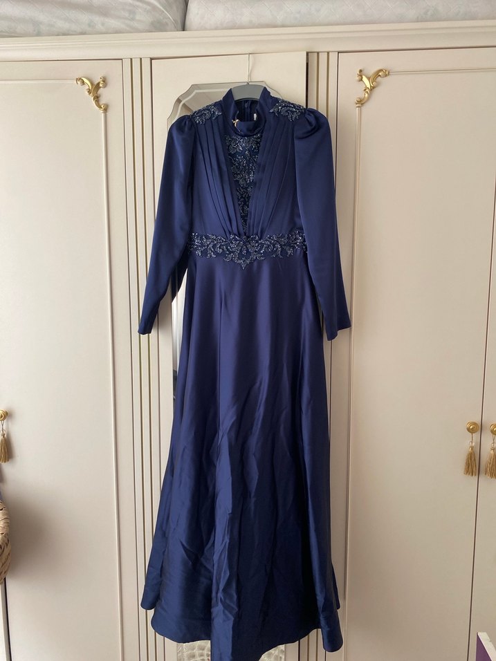 Lacivert, uzun kollu, V yakalı, nakış detaylı ve drapeli, klasik şıklıkta uzun abiye elbise, düğünler için uygun. 1 defa giyildi etiketi üzerinde 38 beden şalı ile birlikte satılıktır .(şal özel dikimdir )