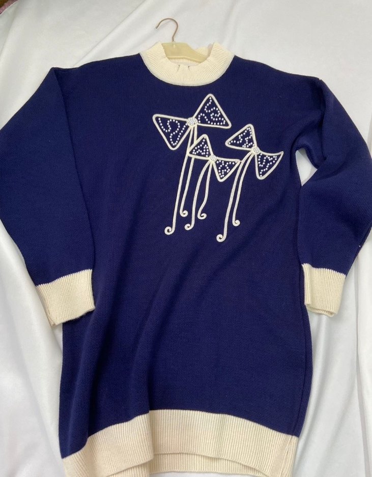 Uzun kollu, bisiklet yaka, triko örgüden yapılmış kadın kazak. Bol kesim ve uzun boy, önünde nakışlı fiyonk desenleri var. Lacivert renkte, günlük kullanıma uygun.