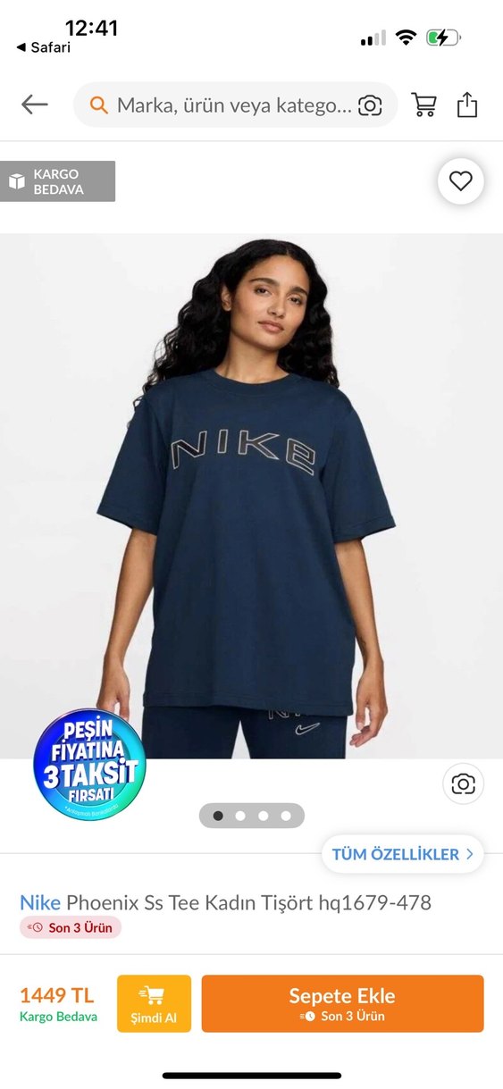 Lacivert renkte, kısa kollu, bisiklet yaka ve bol kesim Nike baskılı denim kumaştan yapılmış kadın tişörtü. Spor ve günlük stil için uygundur. ♀️