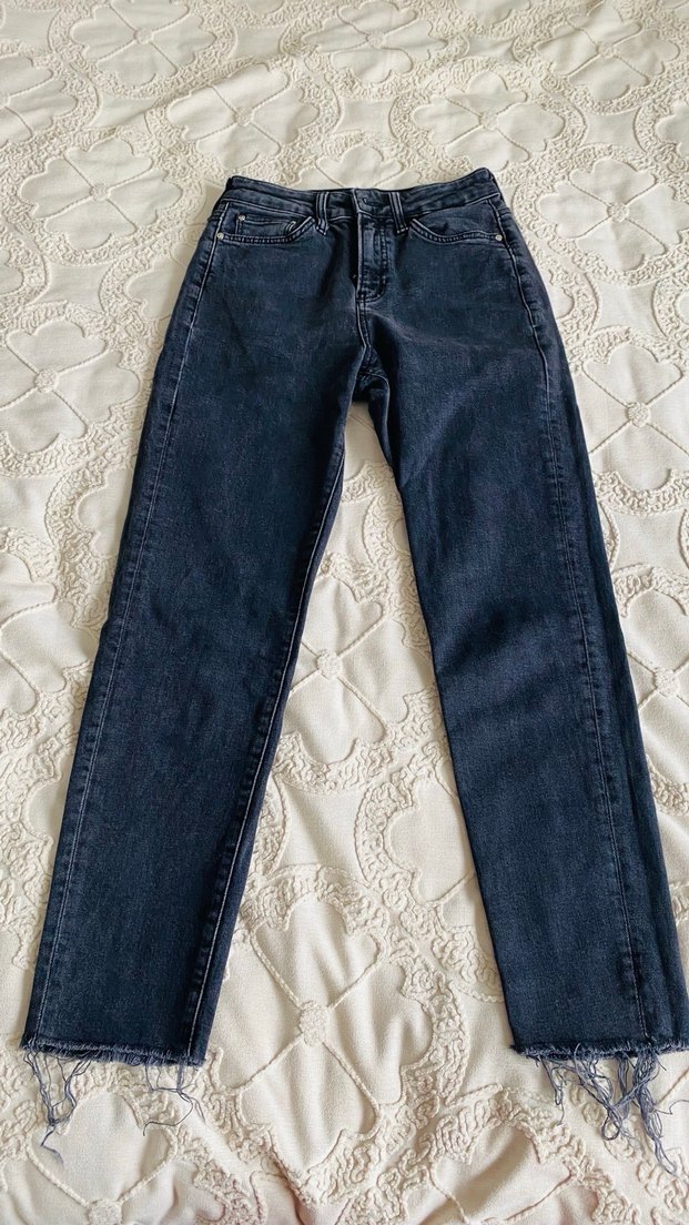 Lacivert renkli, normal boyda kadın denim jean. Düz desensiz, bitimi kesik. Günlük rahat kullanım için uygundur.
