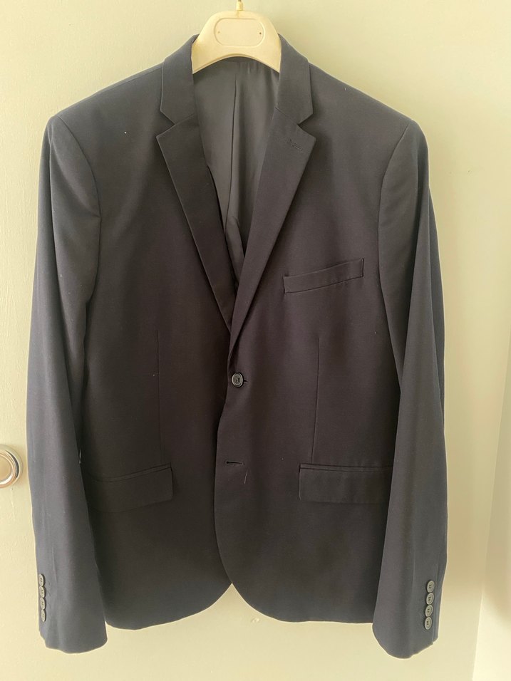 Düğmeli, lacivert renkte(fotoğrafta ışıktan dolayı belli olmamış ama etiketin olduğu fotoğrafta renk net şekilde belli), notch yaka tuxedo ceket. Uzun kollu ve midi boyda, iş ortamına uygun sade tasarım. Kesimi slim fittir. Normcore stilinde, şık ve modern görünümlü.