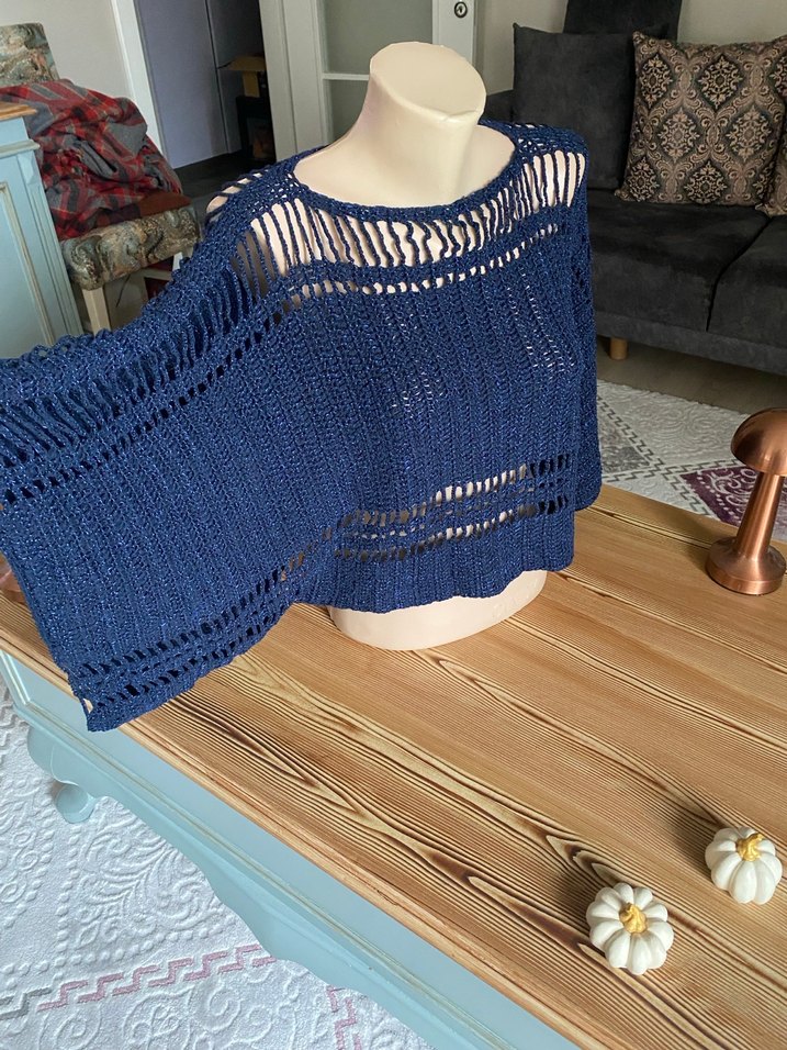 Lacivert örgü bohem kadın kazak, tekne yaka ve bol kesimli, askılı kollu tasarıma sahiptir. Desensiz, nefes alan örgü yapısıyla günlük kullanıma uygundur.