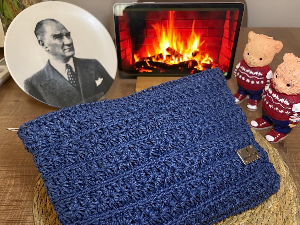 Lacivert renkte, dokulu örgü tasarıma sahip fırın eldiveni, ısıya karşı koruma sağlar ve rahat kullanılır.