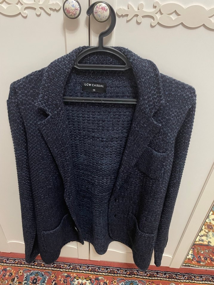 Lacivert renkte, örgü kumaştan yapılmış erkek hırka. Uzun kollu, notched lapel yakalı ve normal boyda. Günlük kullanıma uygun rahat kesim.