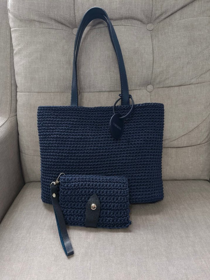 Lacivert örgü kadın çanta ve uyumlu cüzdan seti. Her ikisi de sade, desensiz tasarıma sahip, cüzdanında çıtçıt kapama bulunur. Örgü dokusu günlük kullanıma sıcaklık katar.