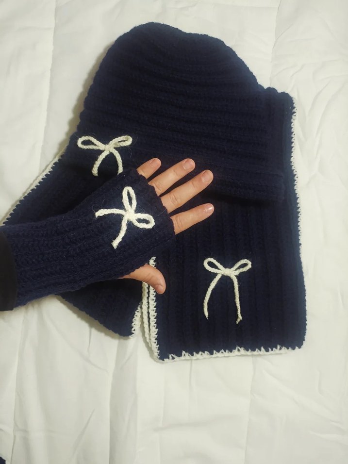 Lacivert örgü kadın üçlü takım beyaz fiyonk detaylarıyla rahat ve sade gotik tarzı yansıtır. sıcacık tutar. uzun ömürlüdür.