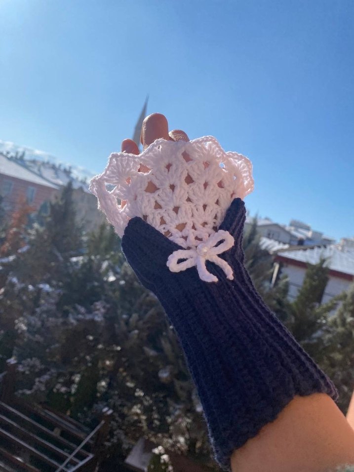 Lacivert örgü kadın eldiveni, beyaz dantel detayları ve fiyonk süsü ile sıcak ve nostaljik goth tarzı sunar.