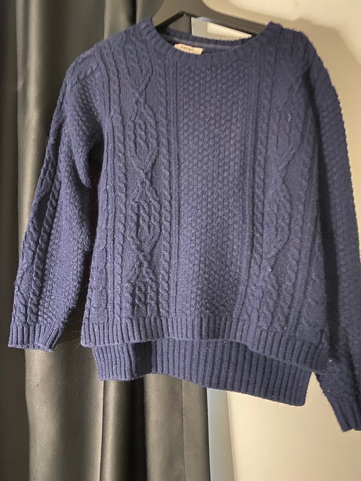 Lacivert örgü kumaştan, yuvarlak yaka ve uzun kollu, bol kesim kadın kazak. Midi uzunlukta, rahat ve desensiz tasarıma sahiptir.