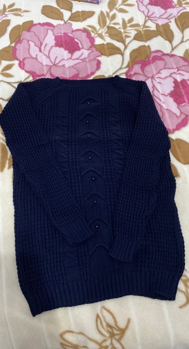 Lacivert örgü kadın kazak, uzun kollu ve yuvarlak yakalıdır. Rahat kesimi ve midi boyu ile günlük kullanıma uygundur.