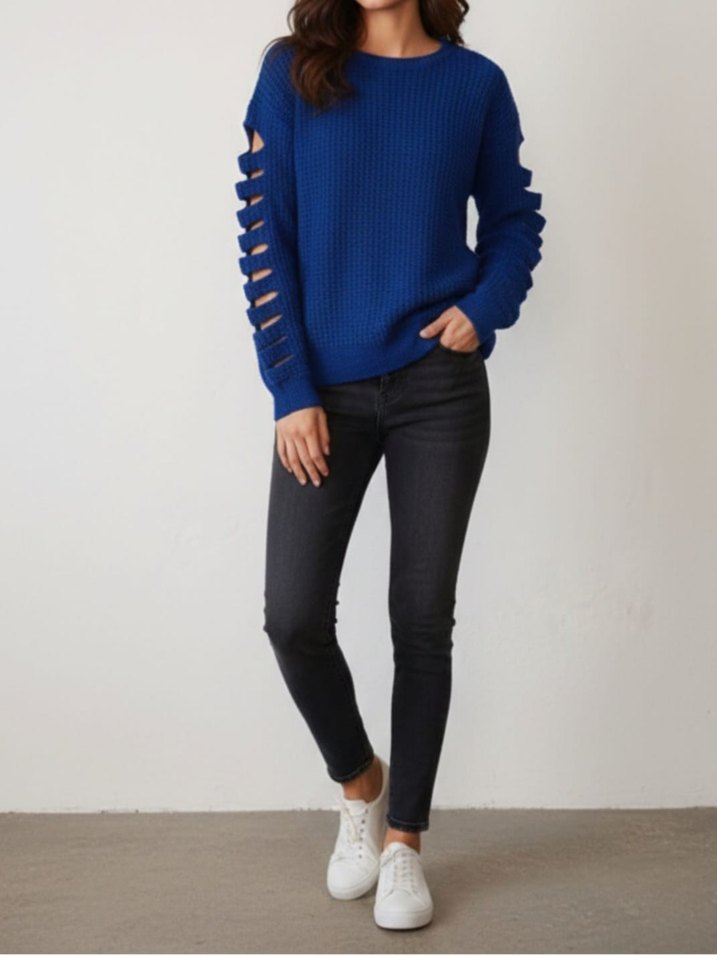 Lacivert renkli, örgü dokulu, yuvarlak yaka ve uzun kollu, kesik detaylı, bol kesim kadın kazak. Günlük kullanım için uygun ve sokak stiliyle uyumlu.