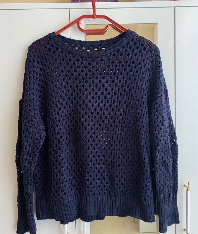 Lacivert renkli, örgü kadın kazak, salaş kesim ve uzun kollu. Yuvarlak yaka ve desen içermeyen rahat bir tasarıma sahip, günlük kullanım için uygundur.
