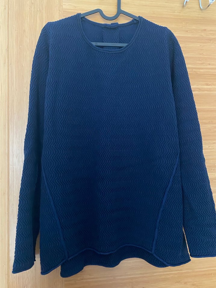 Lacivert renkli, örgü dokulu, yuvarlak yaka ve uzun kollu kadın kazak. Rahat kesimi ve normal uzunluğu ile günlük kullanım için uygundur. Çok rahat her yere uygun bir kazak çok az kullanıldı