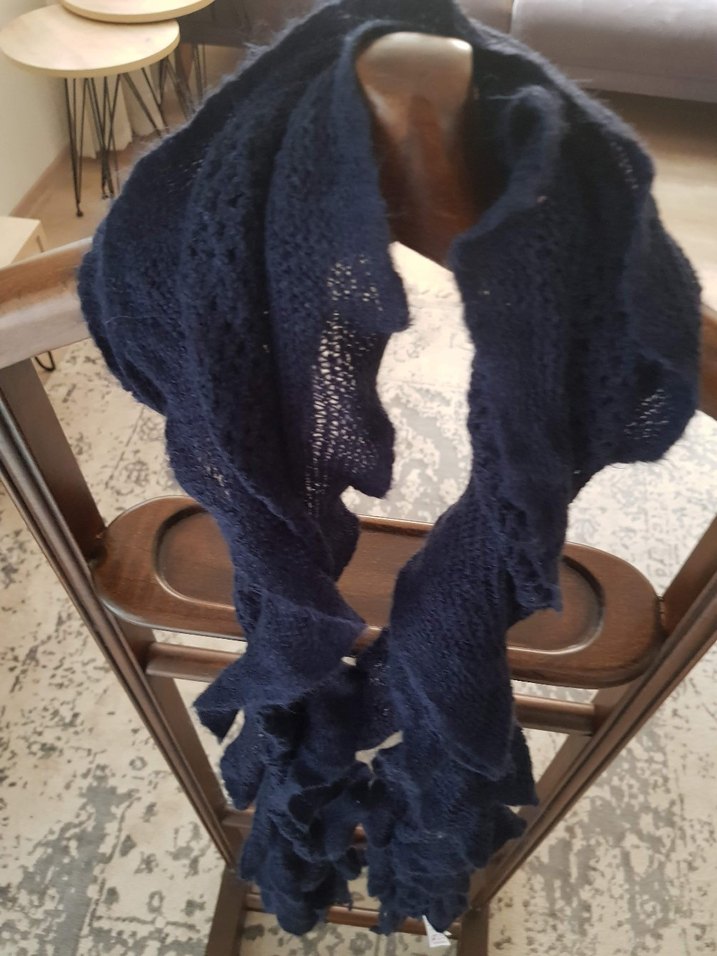 Lacivert renkli, örgü dokulu kadın şalı. Sıcak tutan ve gotik tarzı yansıtan şal, modayı takip edenler için uygun.