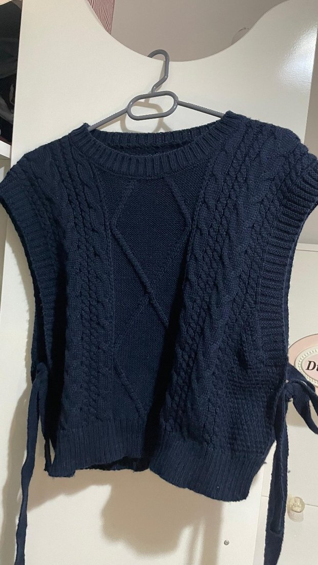 Lacivert renkli, örgü dokulu, bisiklet yaka ve kolsuz kadın süveter. Yanlarda bağcık detaylı, normal boyda ve dar kesimdir. Rahat ve şık bir tercih.