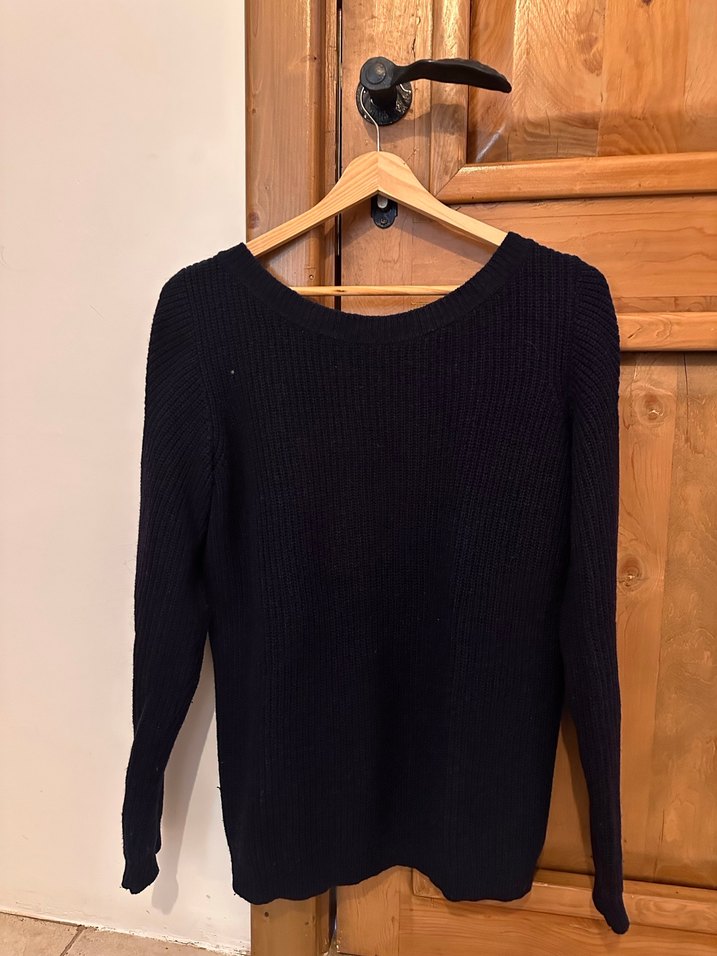 Lacivert örgü yün triko, yuvarlak yaka ve uzun kolludur. Rahat kesimi ve normal boyu ile günlük kullanıma uygundur.