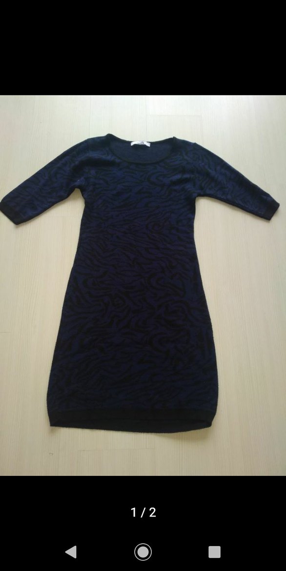 Lacivert renkli, örgü kumaştan yapılmış, bisiklet yaka ve uzun kollu, midi boy, vücuda oturan triko elbise. Rahat ve gotik tarzda, günlük kullanım için uygundur.
