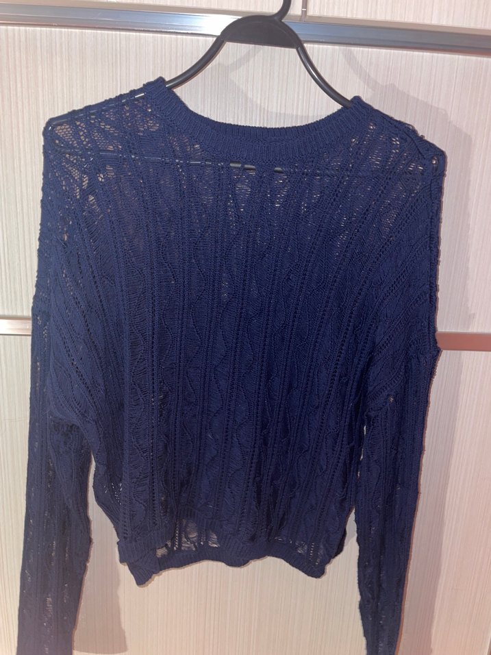 Lacivert örgü triko kazak, uzun kollu ve yuvarlak yakalıdır. Rahat kesimi ve desensiz yapısıyla günlük kullanıma uygundur.
