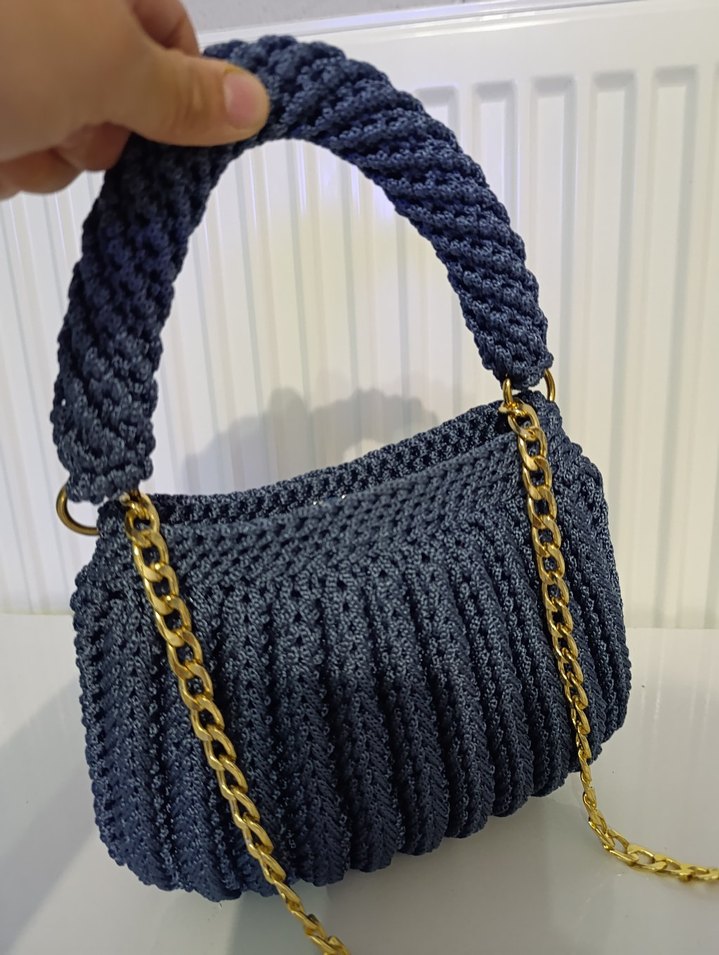Lacivert polyester makrome ipinden yapılmış, kalın örme saplı ve altın zincir detaylı, bohem tarzında kadın çantası. Trendy ve günlük kullanıma uygun. İçi gayet geniştir. Işıktan ötürü renk tonunda oynama olabilir.