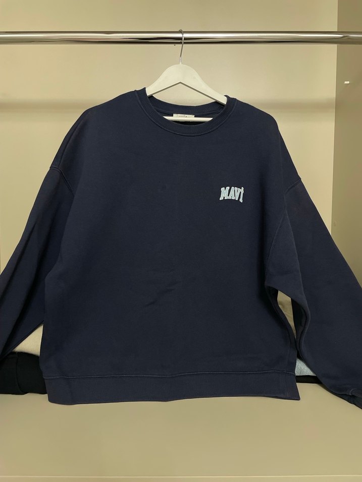 Lacivert renkte, baskılı, yuvarlak yaka ve uzun kollu, bol kesim kadın sweatshirt. Denim kumaştan, günlük kullanım için uygundur.