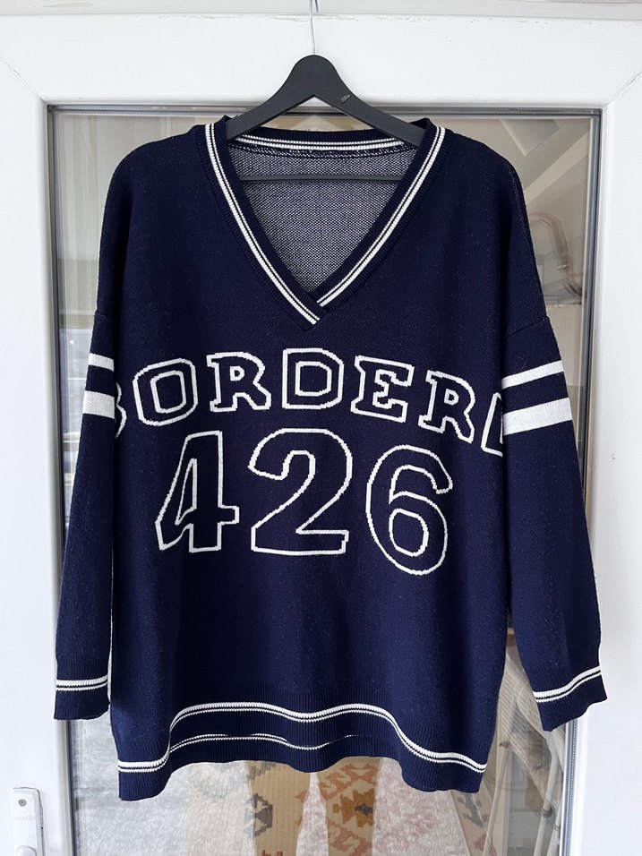 Lacivert örgü triko kazak, V yaka ve uzun kolludur. Önünde baskılı sayılar ve harfler bulunur, rahat ve salaş kesimlidir. Günlük kullanım için uygundur. Sorunsuz iki kol arası 65 boyu 73