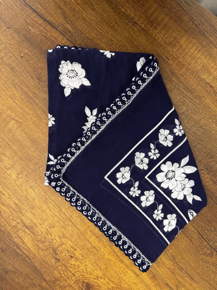Yumuşak pamuklu kumaştan, beyaz çiçek desenli ve narin oyalı lacivert kadın fuları.