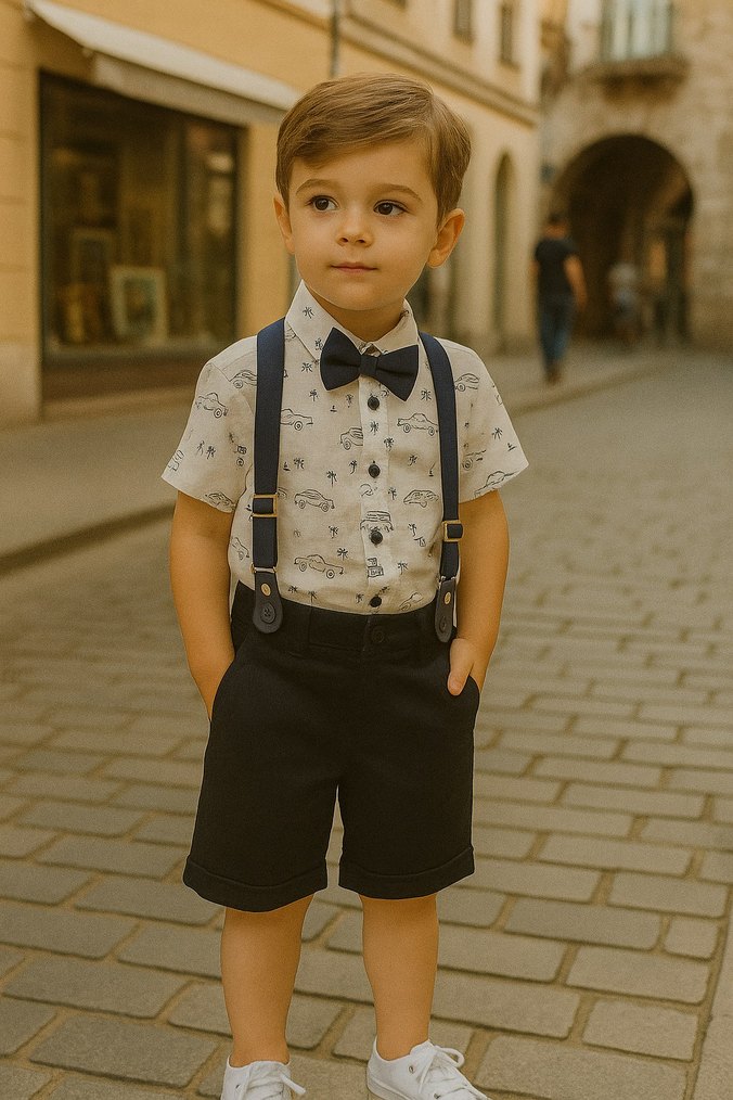 Lacivert Pantolonlu çocuk askılı, papyonlu ve desenli gomlekli trend sokak tarzı için uygundur. 3-6 yaş arasindadir
