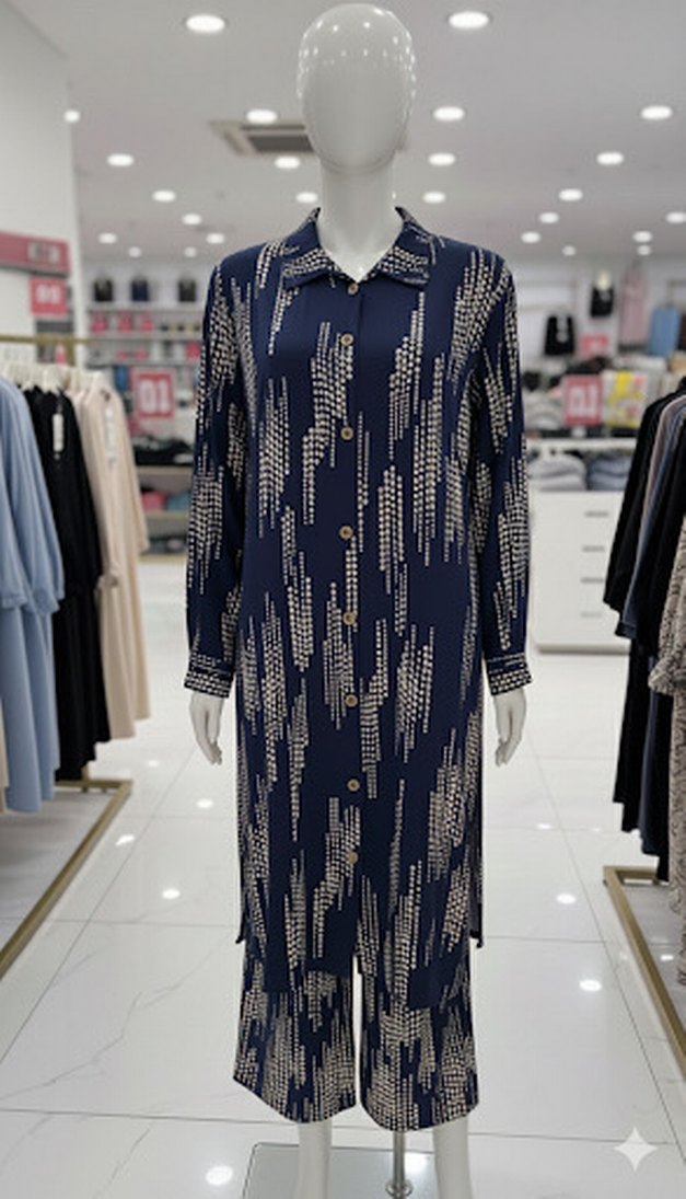 Lacivert pantolonlu uzun tunik takımı, gömlek yakalı ve uzun kolludur. Viskon kumaştan günlük kullanıma uygundur.