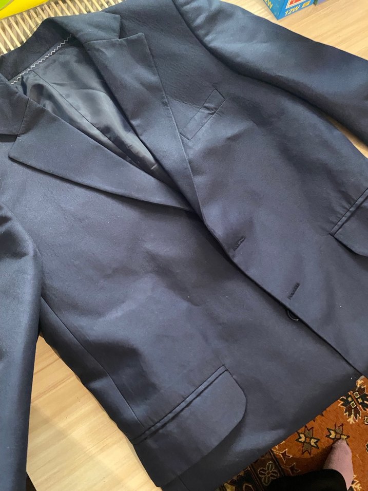 Lacivert parlak kumaştan, çıtçıtlı, normal kesim erkek takım elbise ceketi. Uzun kollu ve klasik kesim, ofis için uygundur. ️