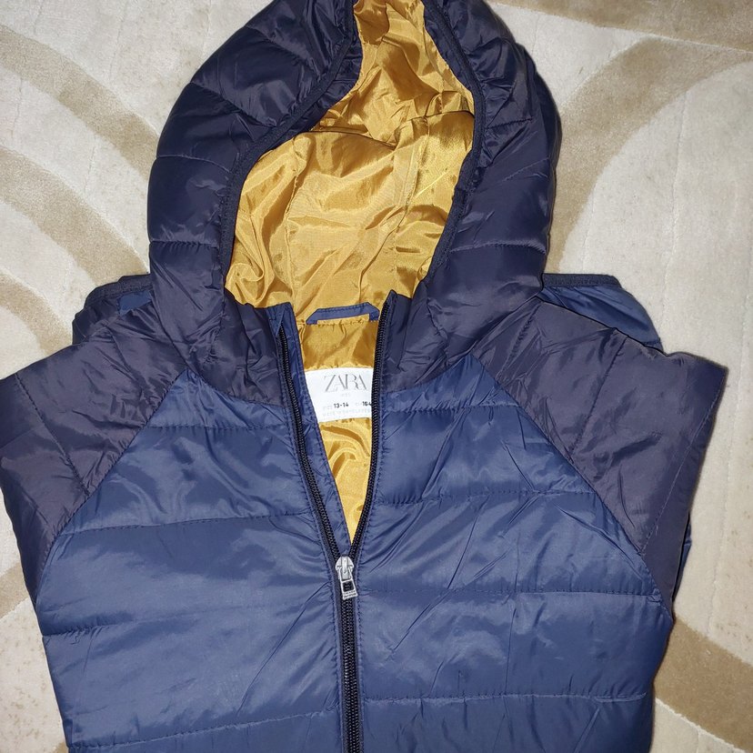 parlak açık lacivert ve koyu lacivert renginden oluşan Zara marka 13-14 yaş erkek çocuk montu içi elyaftan kaplı kusursuz yağmurlu günde rahatlıkla giyilebilir mont
