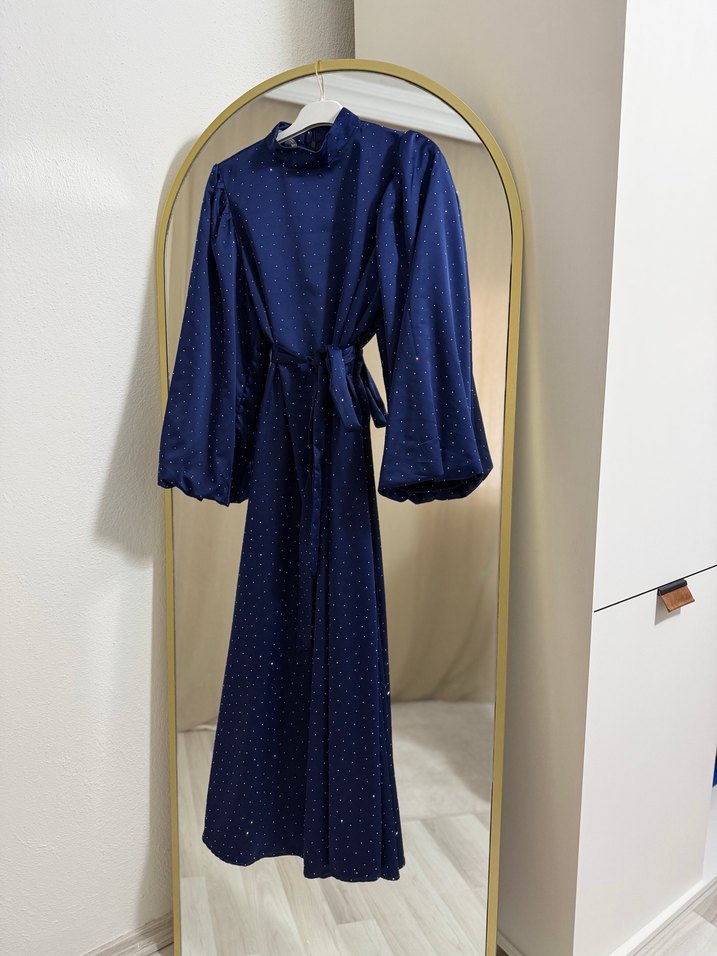 Lacivert renkli, yüksek yakalı ve uzun kollu bu uzun elbise, yumuşak ve parlak kumaştan drapeli tasarıma sahiptir. Yakasına takıp çıkarılır çiçek detayı vardır.Şalı yanında hediyedir