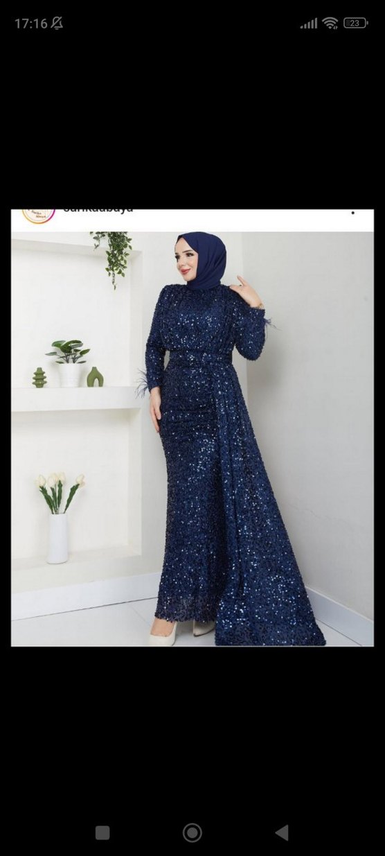 Lacivert, yüksek yakalı ve uzun kollu, vücuda oturan bu abiye elbise, parlak desenli kumaşı ve drapeli detaylarıyla düğünler için uygundur. ✨